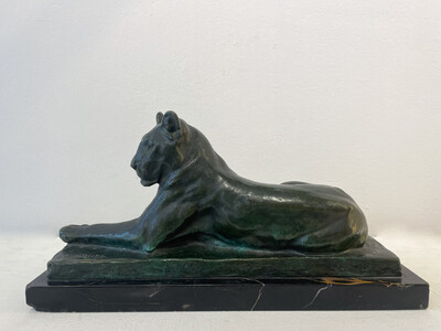 Art Deco Bronze Sculpture " Lionne Couchée" by Louis Riché, France, 1930s