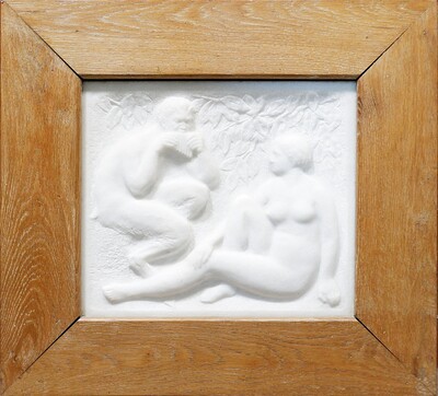 "Pan et Nymphe" Carrara marble bas-relief sculpture signed Octave Larrieu - france 1940s