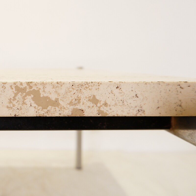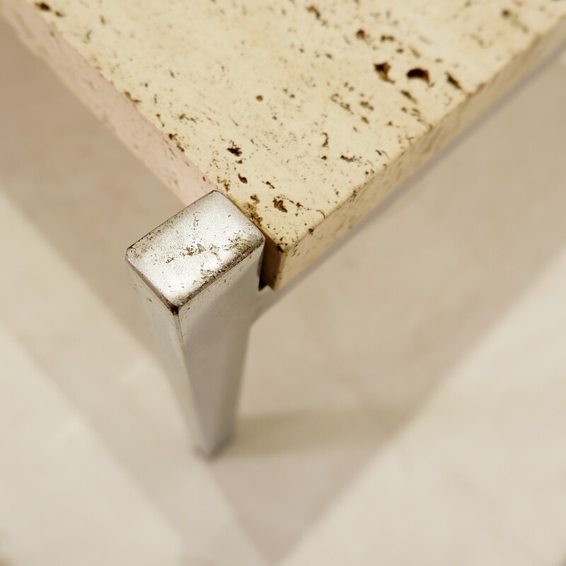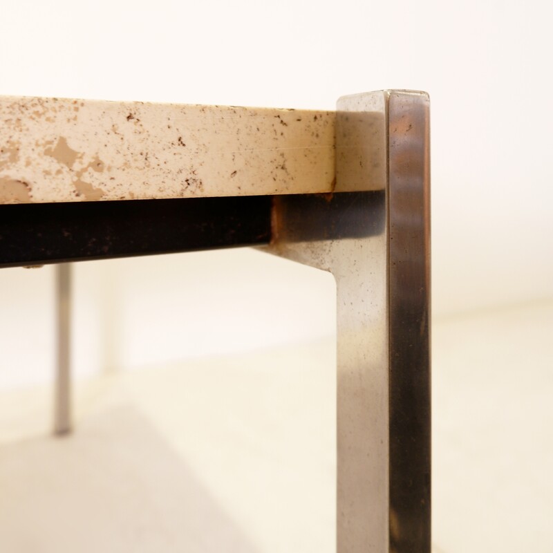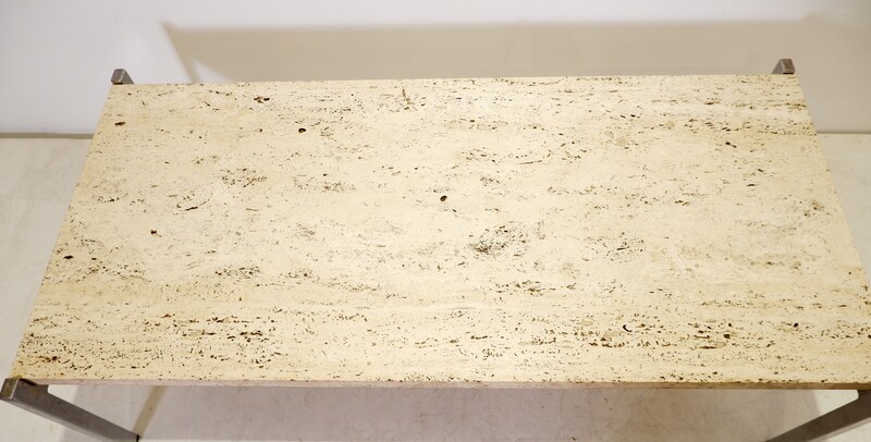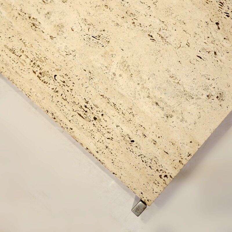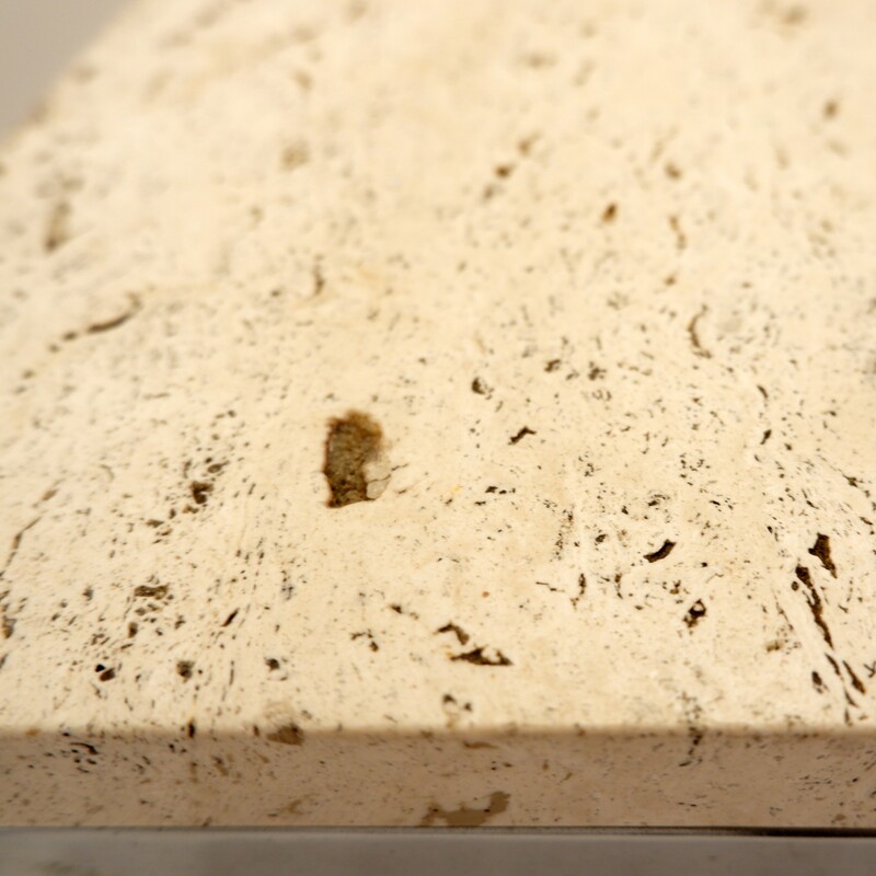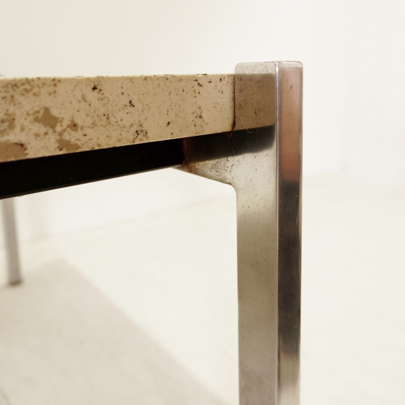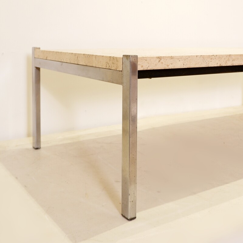 Mid-Century Metaform attributed rectangular Travertine coffee table. Has a beautiful solid travertine top on a black stained wood frame and square chrome legs. A chic mixture of materials assembled into an attractive coffee or side table. In original condition with wear consistent with age and use.