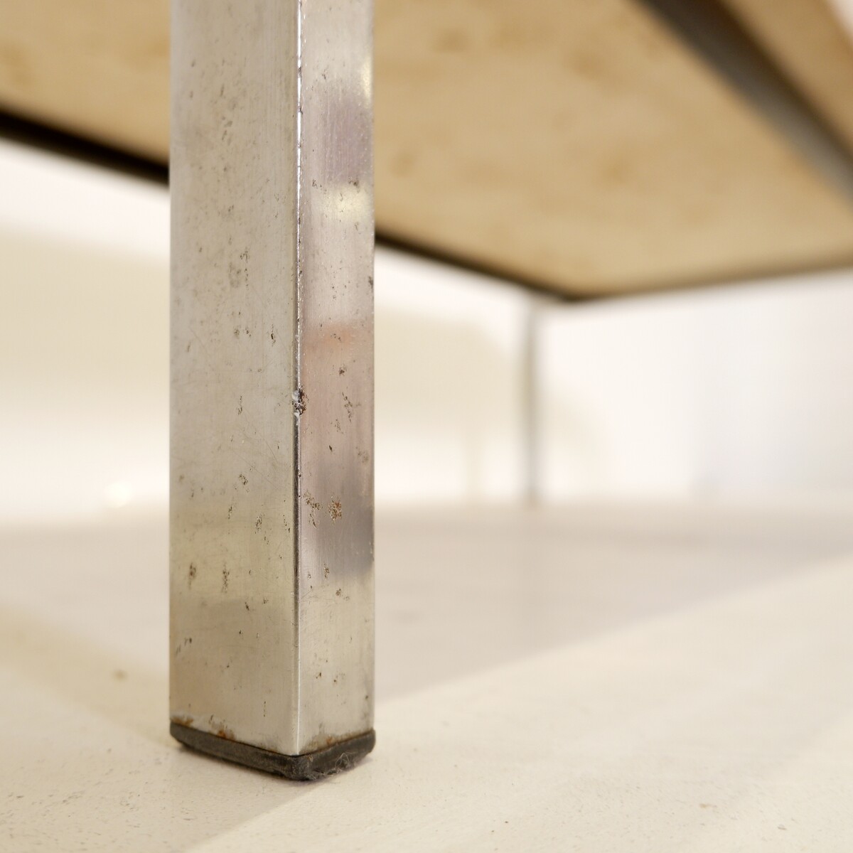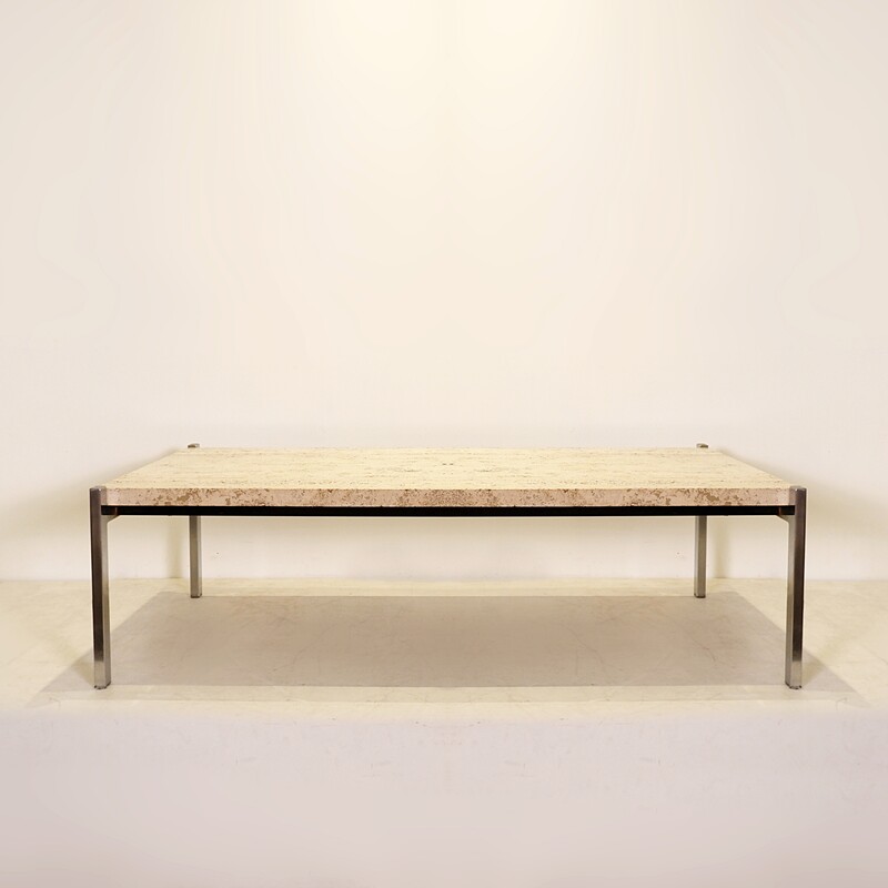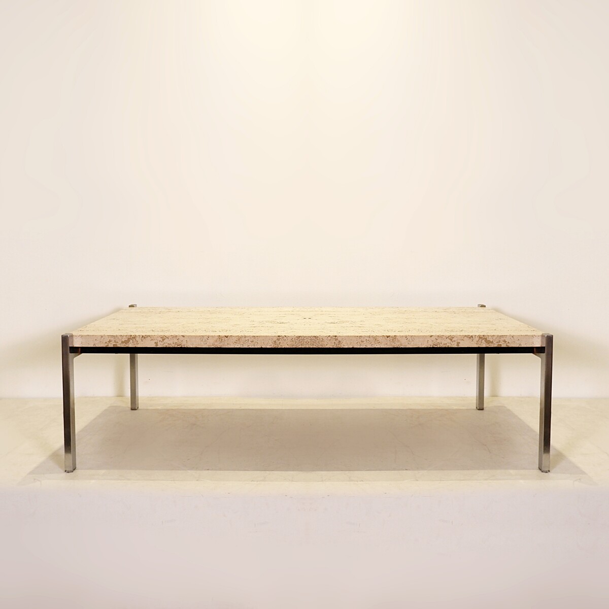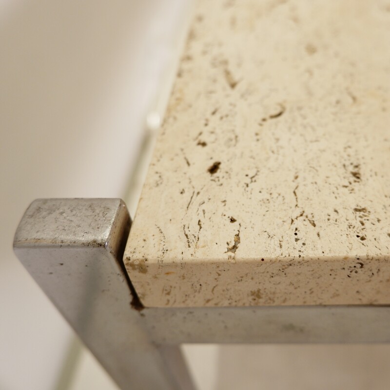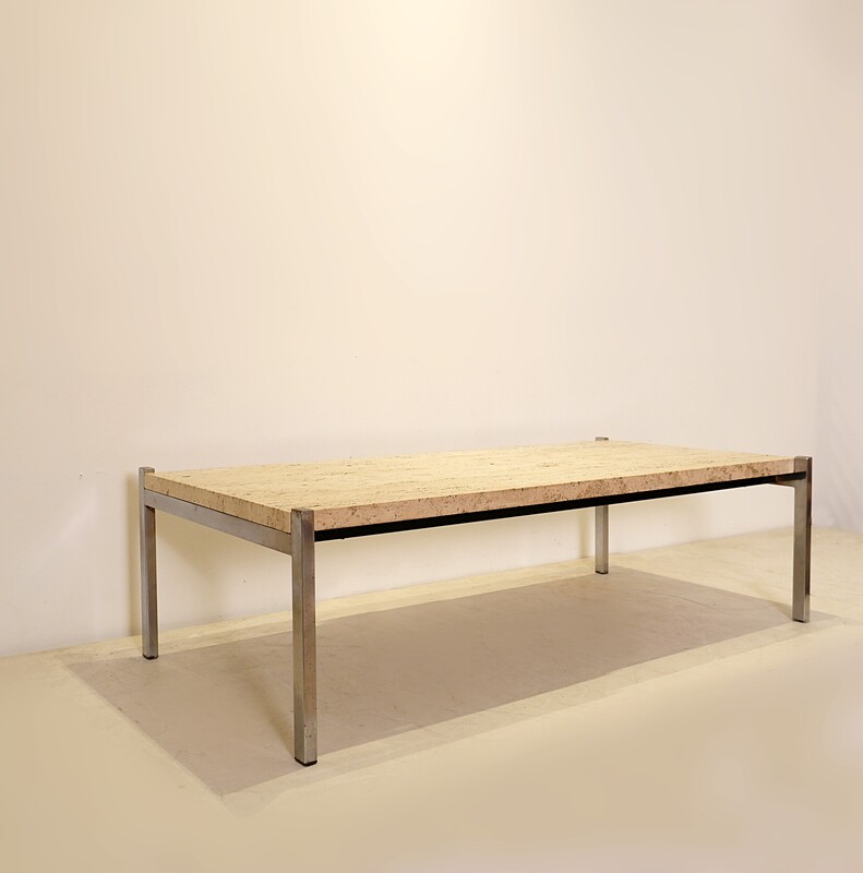 Mid-Century Metaform attributed rectangular Travertine coffee table. Has a beautiful solid travertine top on a black stained wood frame and square chrome legs. A chic mixture of materials assembled into an attractive coffee or side table. In original condition with wear consistent with age and use.
