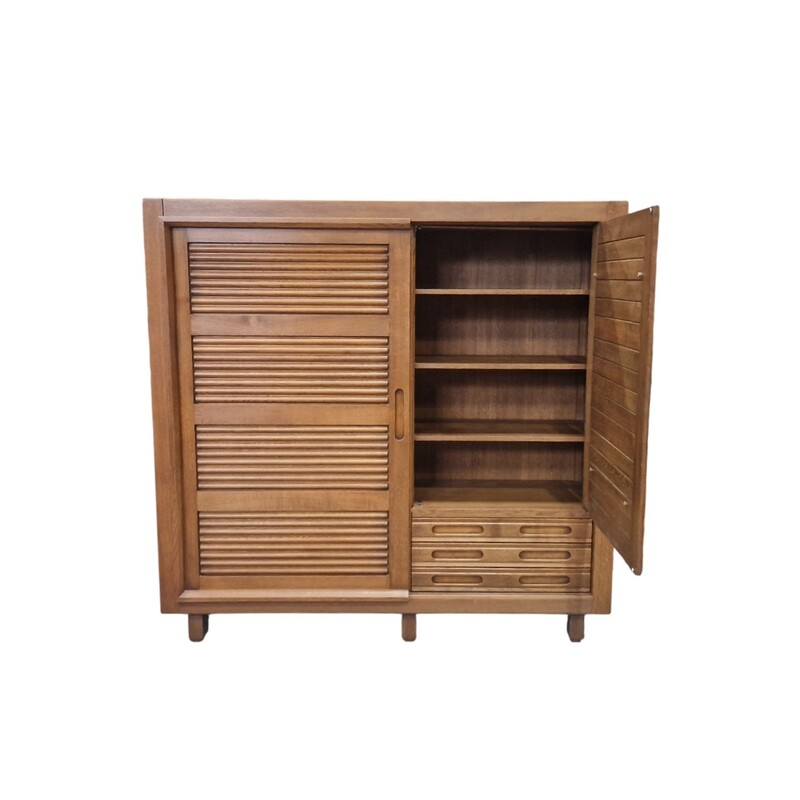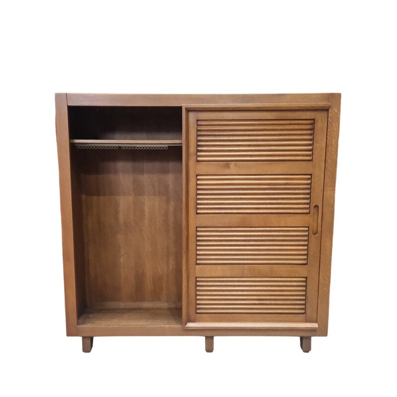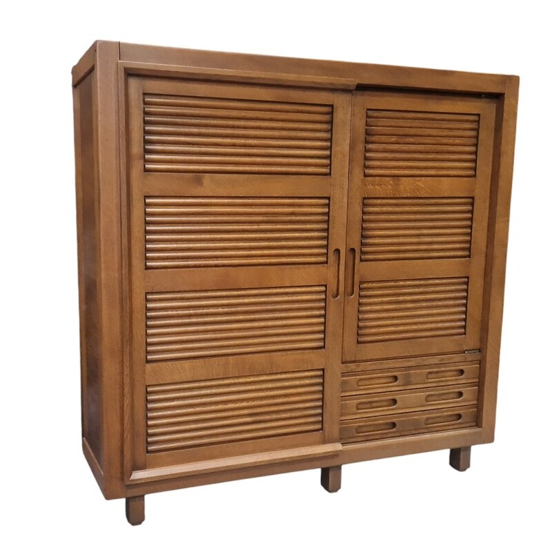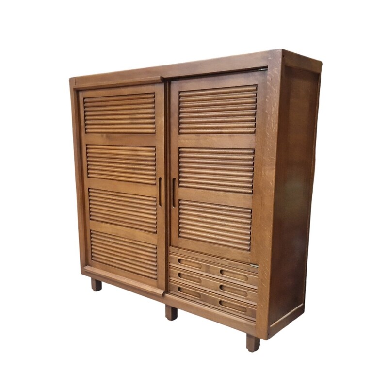 Beautiful Japanese-style wardrobe in solid oak by Guillerme and Chambron for ‘Votre Maison’ publisher. This rare, high-quality wardrobe opens with a sliding door, a hinged door and three drawers, revealing a hanging space and a linen compartment.