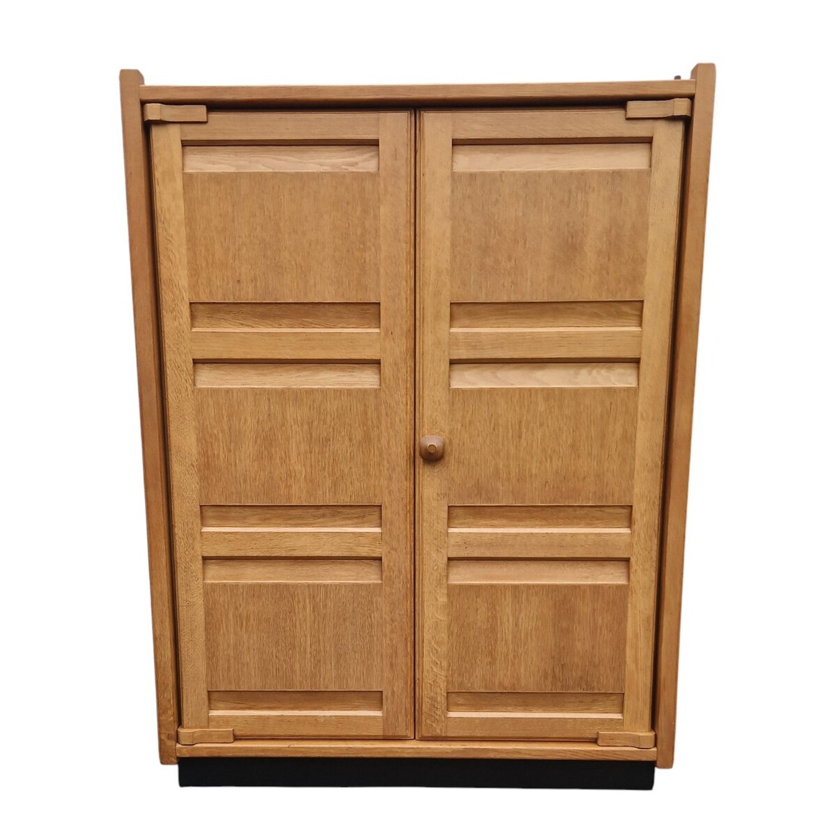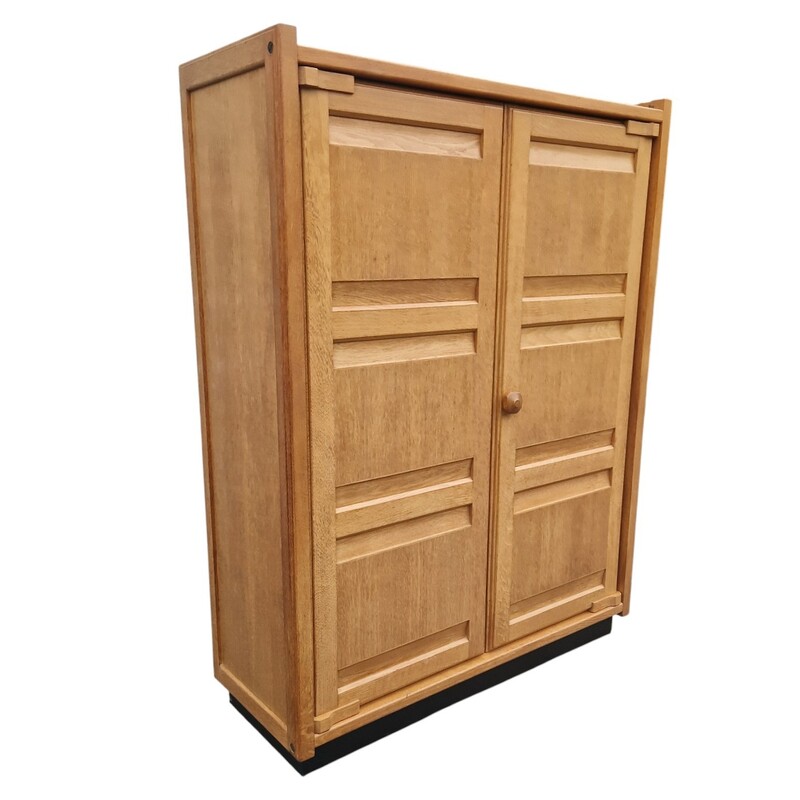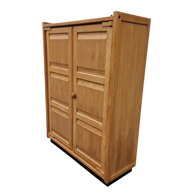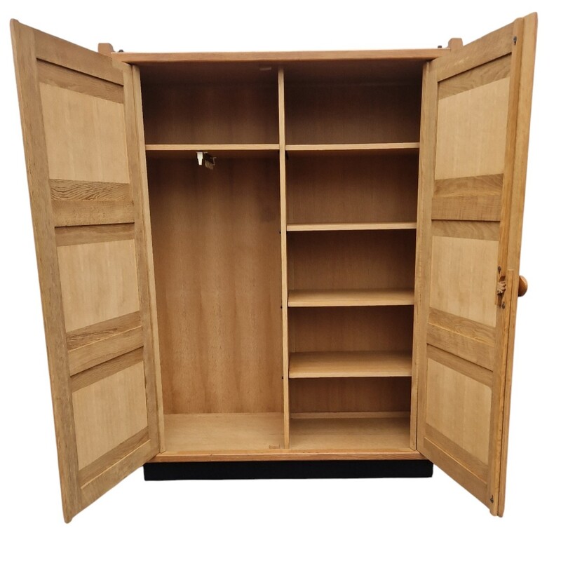 Attractive solid light oak wardrobe, Guillerme and Chambron for ‘Votre Maison’ publisher. This wardrobe has a hanging rail on the left-hand side, with the right-hand side fitted out as a linen cupboard. Additional shelves allow you to change the layout of this attractive storage unit as required.