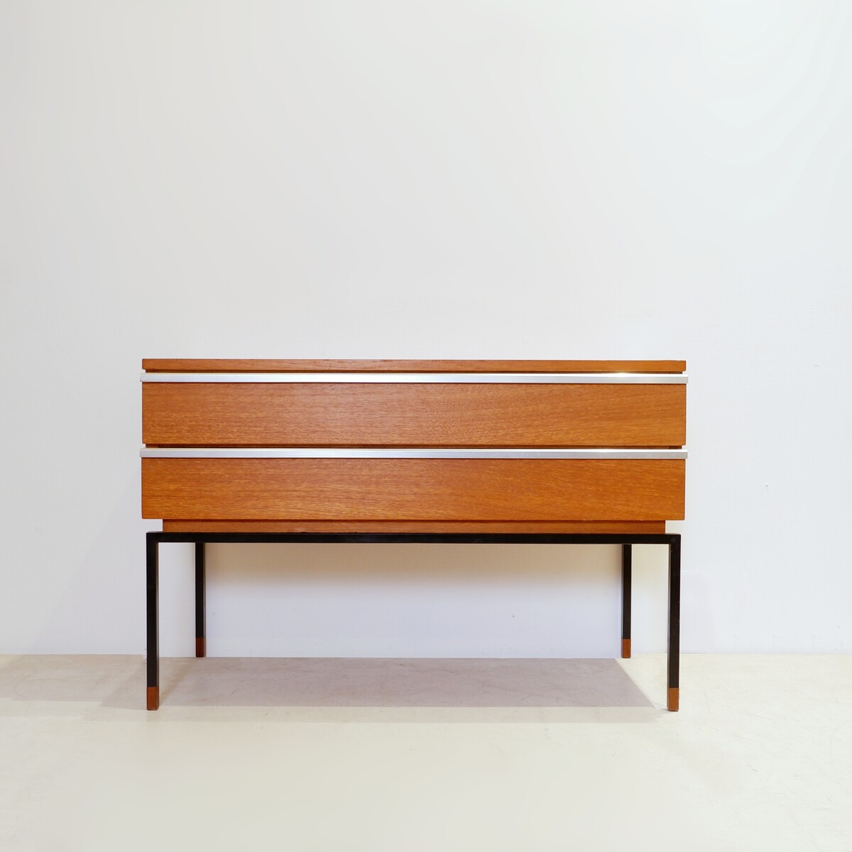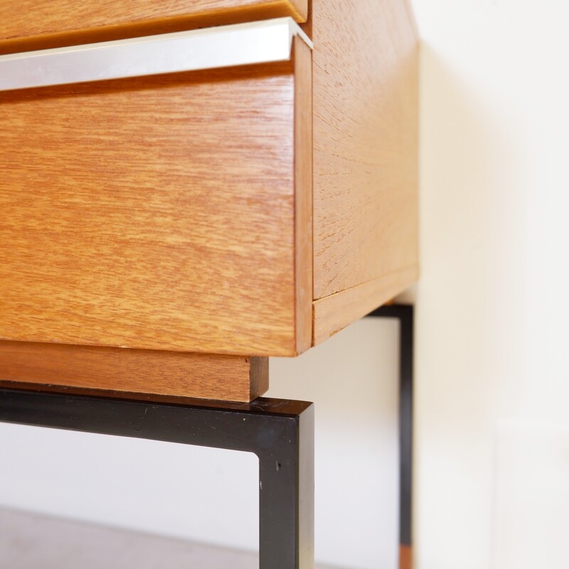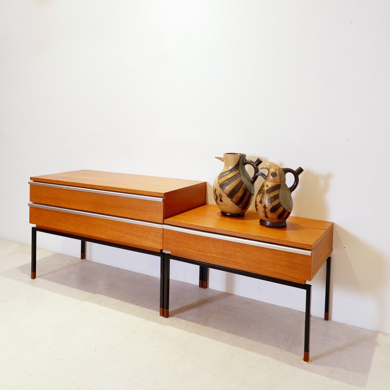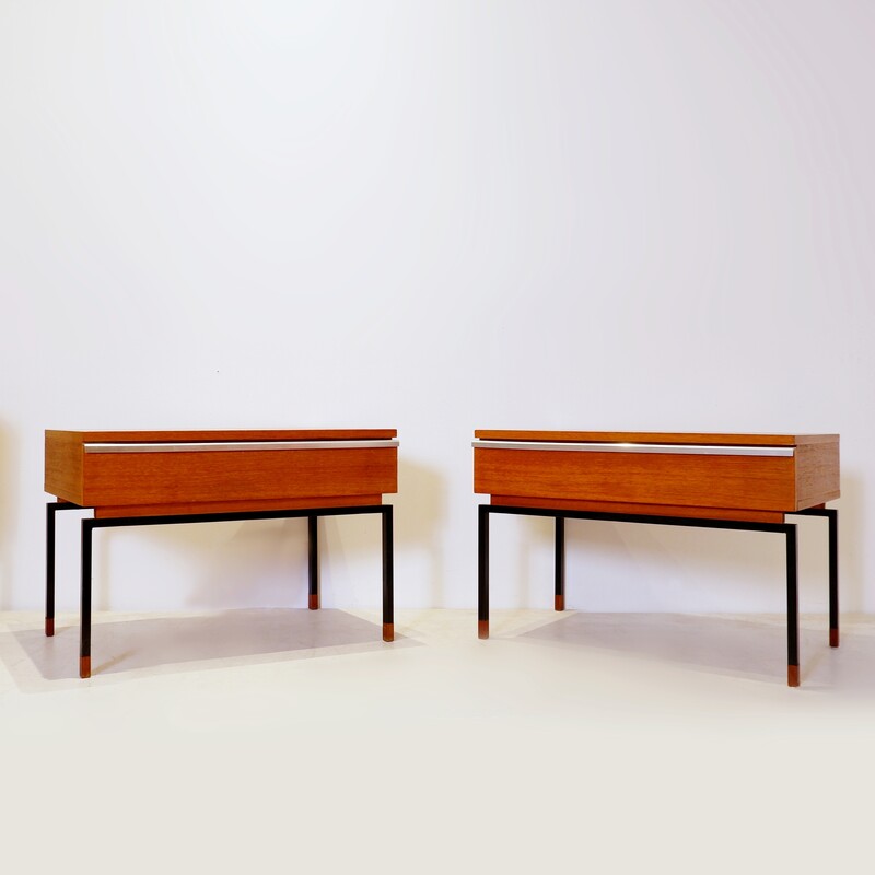 This set consists of small tables or bedside tables and a mid-century modern two-drawer chest of drawers in wood with black metal and wood legs.