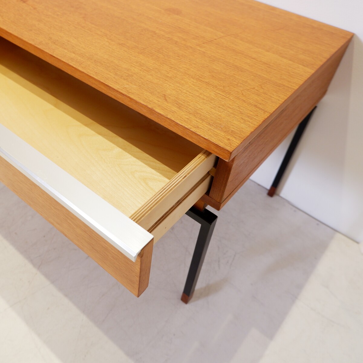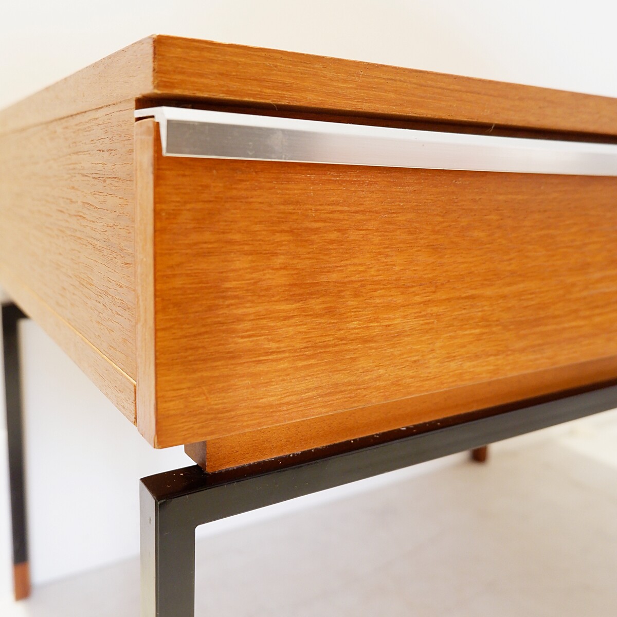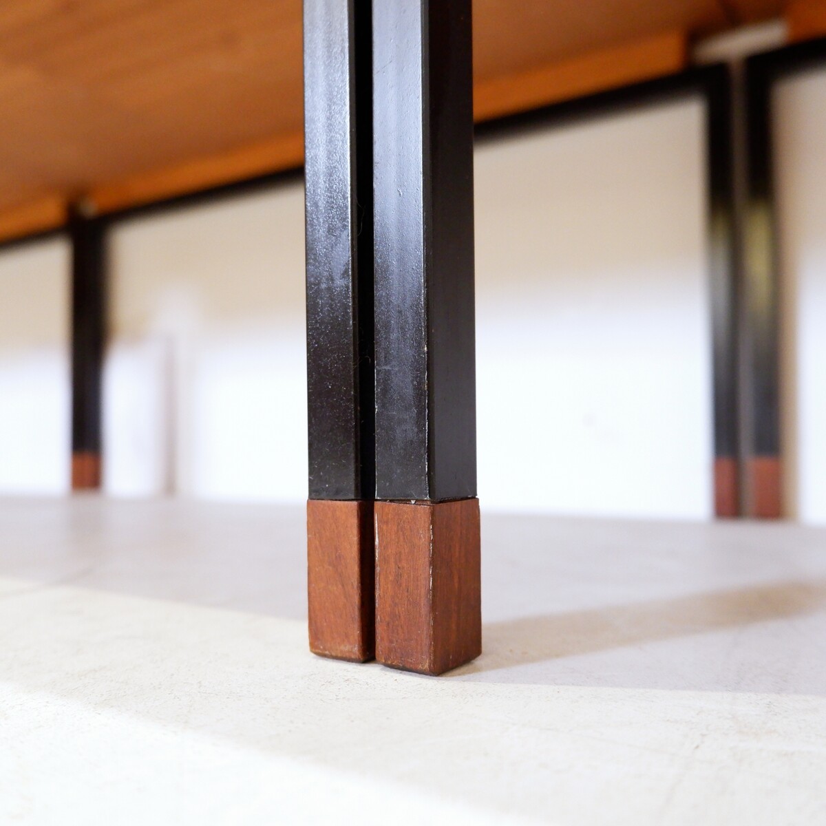 This set consists of small tables or bedside tables and a mid-century modern two-drawer chest of drawers in wood with black metal and wood legs.
