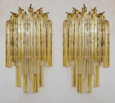 2 Murano "Triedri" cascade sconces by Paolo Venini - amber and clear crystal pendants.- 1970s -