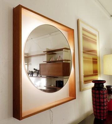 Large illuminated round mirror with teak frame
