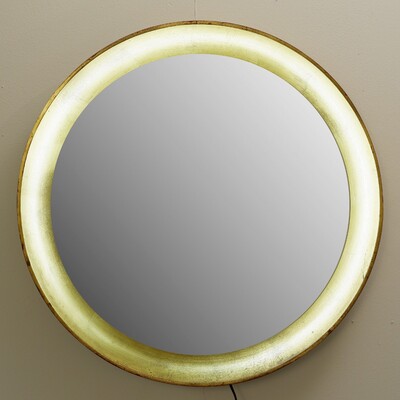 Round convex wall mounted and backlit mirror gold patina