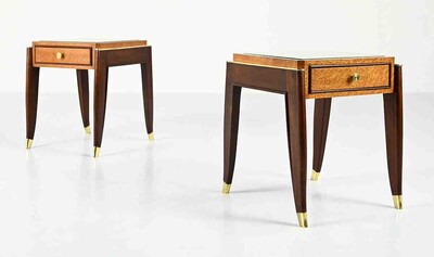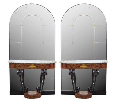 Pair Of 1930s Art Deco Consoles In Burl Wood, Marble And Cast Iron With Mirror