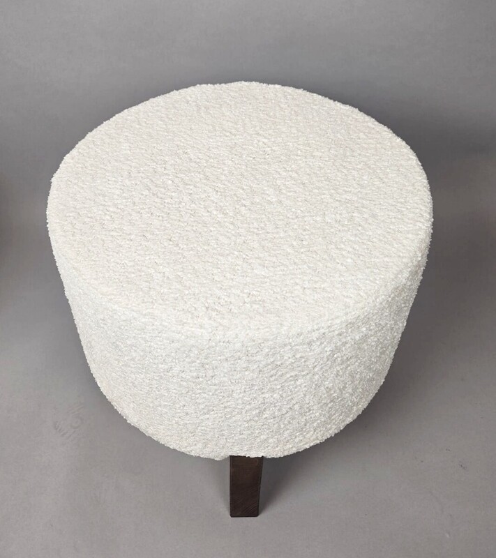 Pair of contemporary stools, wood and white bouclé fabric